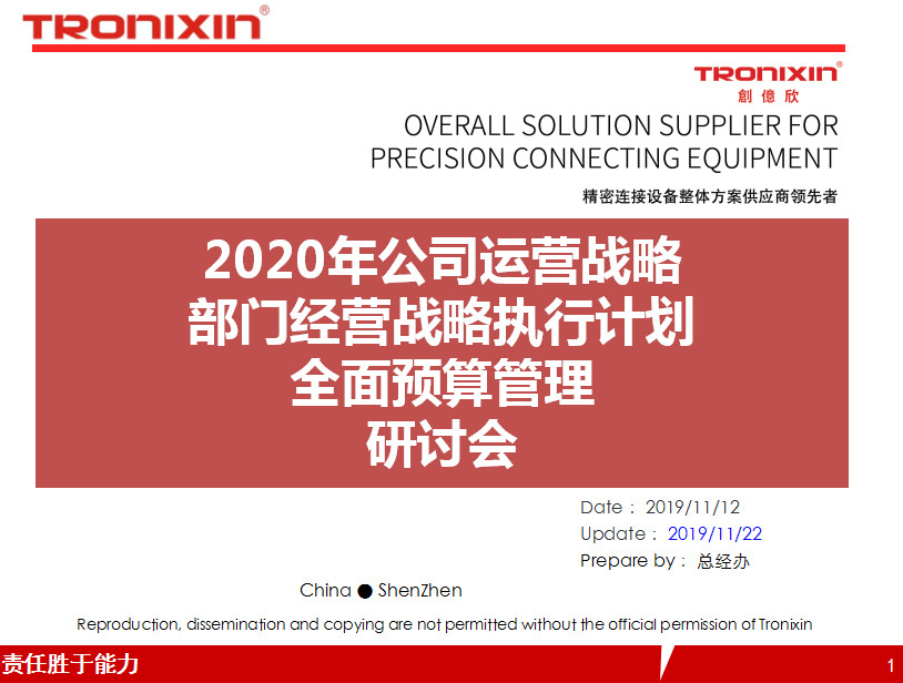 2020年公司运营战略\部门经营战略执行计划\全面预算管理研讨会,公司提出了2020年业绩增加30~40%的战略目标,这个战略目标的实现,在新产品开发和发现的前提下,依赖于人资、制造、资材、品质及全面预算的整体规划。通过此次战略规划研讨,提升公司的组织能力,梳理公司的战略与人力资源规划,优化人力资源基础管理体系。